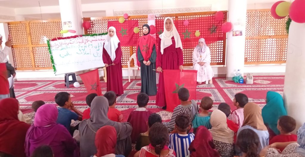 وفي نفس الإطار واحتفاء بالذكرى الخامسة والعشرين لتربع الملك على العرش، نظمت المرشدتان سعاد حاجي و نادية حاجي بتنسيق مع محفظة القرآن الكريم خديجة صاير حفلا تحت شعار : ” عيد العرش تخليد للعروة الوثقى بين العرش والشعب ” بمسجد سيدي علال البوشيخي عين بني مطهر يوم الإثنين 29 يوليوز 2024 صباحا لفائدة تلاميذ الدورة الصيفية.