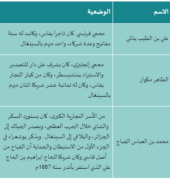 سننتقل الآن إلى تجار من أصل فاسي وكانت لهم تجارة بالسينغال ولكنهم لم يستقروا هناك: