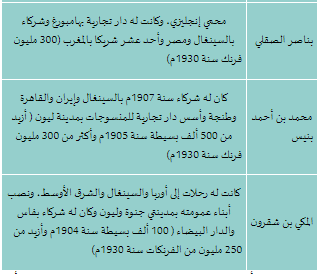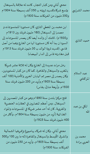 وهناك العديد من التجار الذين كانت لهم تجارة بالسينغال، تذكرهم المراجع دون ذكر المناطق التي انحدروا منها، لكن أغلبهم كانوا يشتغلون بتصدير واستيراد النسيج مما يرجح أنهم من أصل فاسي، خاصة وأننا نعلم الشأن الذي كانت عليه فاس من هذه الناحية(تجارة النسيج) خلال القرن التاسع عشر الميلادي. إضافة إلى أن مصطفى بوشعراء ذكر ملاحظة مهمة، تخص التجار المغاربة الذين عرف بهم،- وقد اعتمدنا عليه بخصوص ذلك- فقال: «وقد نزح أغلب هؤلاء التجار الفاسيون إلى الدار البيضاء في مطلع هذا القرن»، أي القرن العشرين الميلادي18 ، مما يؤكد الأصل الفاسي لهؤلاء التجار، وأن التاجر الفاسي الذي كانت له تجارة واسعة في أوروبا، كانت له أيضا تجارة بإفريقيا الغربية. وهذه لائحة بأسمائهم: