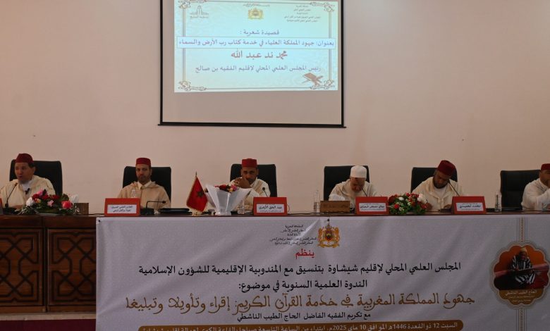 شهدت مدينة شيشاوة يوم السبت 10 ماي 2025 تنظيم ندوة وطنية أبرز خلالها عدد من العلماء الدور الريادي الذي تقوم به مؤسسة إمارة المؤمنين، في خدمة القرآن الكريم نشرًا وتعليمًا وتأويلاً.