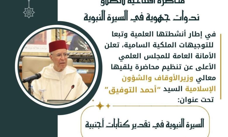 وسيؤطر المحاضرة الافتتاحية أحمد التوفيق، وزير الأوقاف والشؤون الإسلامية، تحت عنوان: «السيرة النبوية في تقدير كتابات أجنبية»