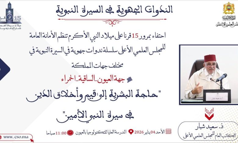 يلقي الكاتب العام للمجلس العلمي الأعلى، سعيد شبار، يوم الأحد 4 يناير 2026 بالمدرسة العليا للتكنولوجيا بالعيون، ابتداءً من الساعة 11:00 صباحاً، محاضرة بعنوان: “حاجة البشرية إلى قيم وأخلاق الدين في سيرة النبي الأمين ﷺ”.
