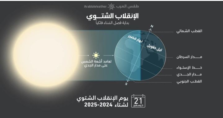 يحدث الانقلاب الشتوي يوم السبت 21 دجنبر وستكون الشمس ساطعة مباشرة على مدار الجدي وهي علامة على بداية فصل الشتاء فلكياً في النصف الشمالي من الكرة الأرضية (والذي يستمر حوالي 89 يوماً) والانقلاب الصيفي في النصف الجنوبي.