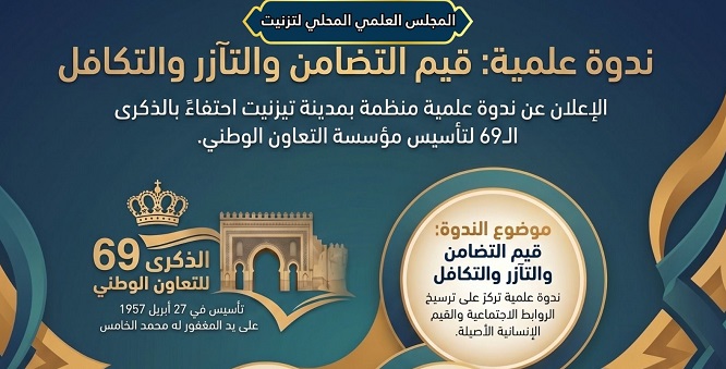 تحتضن مدينة تيزنيت، يوم الثلاثاء 21 أبريل 2026، ندوة علمية ينظمها المجلس العلمي المحلي، تتمحور حول موضوع قيم التضامن والتآزر والتكافل، وذلك في إطار تعزيز الوعي المجتمعي بأهمية هذه القيم في ترسيخ الروابط الإنسانية والاجتماعية.
