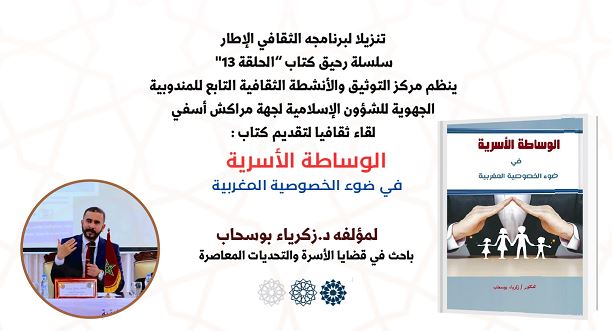ينظم مركز التوثيق والأنشطة الثقافية بمراكش، التابع للمندوبية الجهوية للشؤون الإسلامية لجهة مراكش-آسفي، الحلقة 13 من سلسلة «رحيق كتاب» لتقديم كتاب «الوساطة الأسرية في ضوء الخصوصية المغربية» للدكتور زكرياء بوسحاب، وذلك يوم الجمعة 19 دجنبر 2025 على الساعة الثالثة والنصف بعد الزوال بمكتبة المركز بالمركب الإداري والثقافي محمد السادس للأوقاف – باب إغلي.