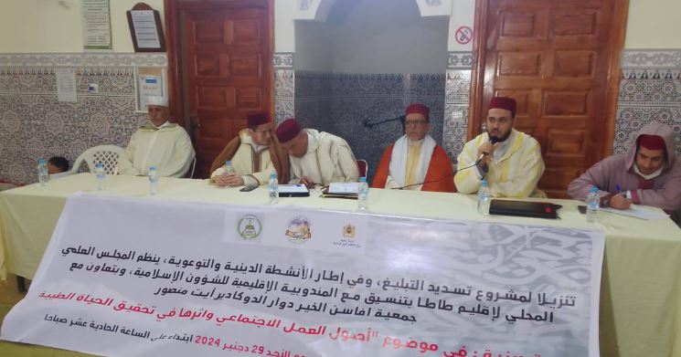 نظم المجلس العلمي المحلي لإقليم طاطا يوم الأحد 29 دجنبر 2024 بطاطا ندوة علمية بمسجد دوار دوگادير أيت منصور في موضوع: “أسس العمل الإجتماعي وأثرها في تحقيق الحياة الطيبة”.