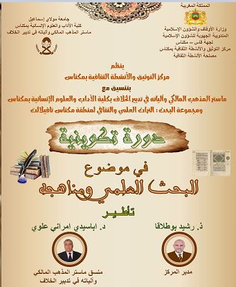 يؤطر هذه الدورة التكوينية حول البحث العلمي ومناهجه: الأستاذ رشيد بوطلاقا، مدير مركز التوثيق والأنشطة الثقافية بمكناس والأستاذ اباسيدي امراني علوي، منسق ماستر المذهب المالكي وآلياته في تدبير الخلاف.